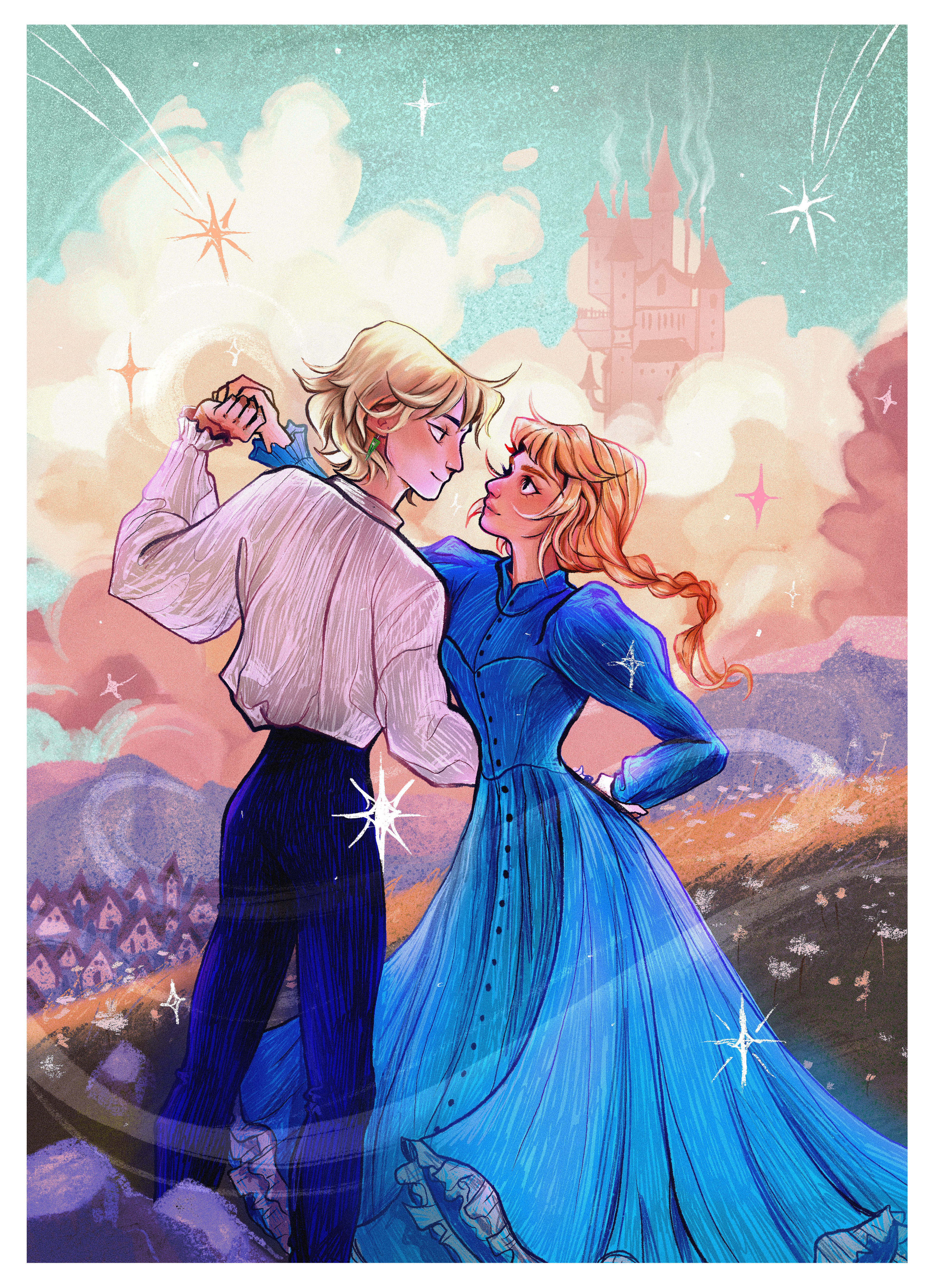 A personal project to create an illustration for fantasy book 'Howl's Moving Castle'. I created the illustration first and then adapted the design into a full book cover spread. I wanted this artwork to have a textured and organic style with warm and bright colours inspired by the magical themes of the book.