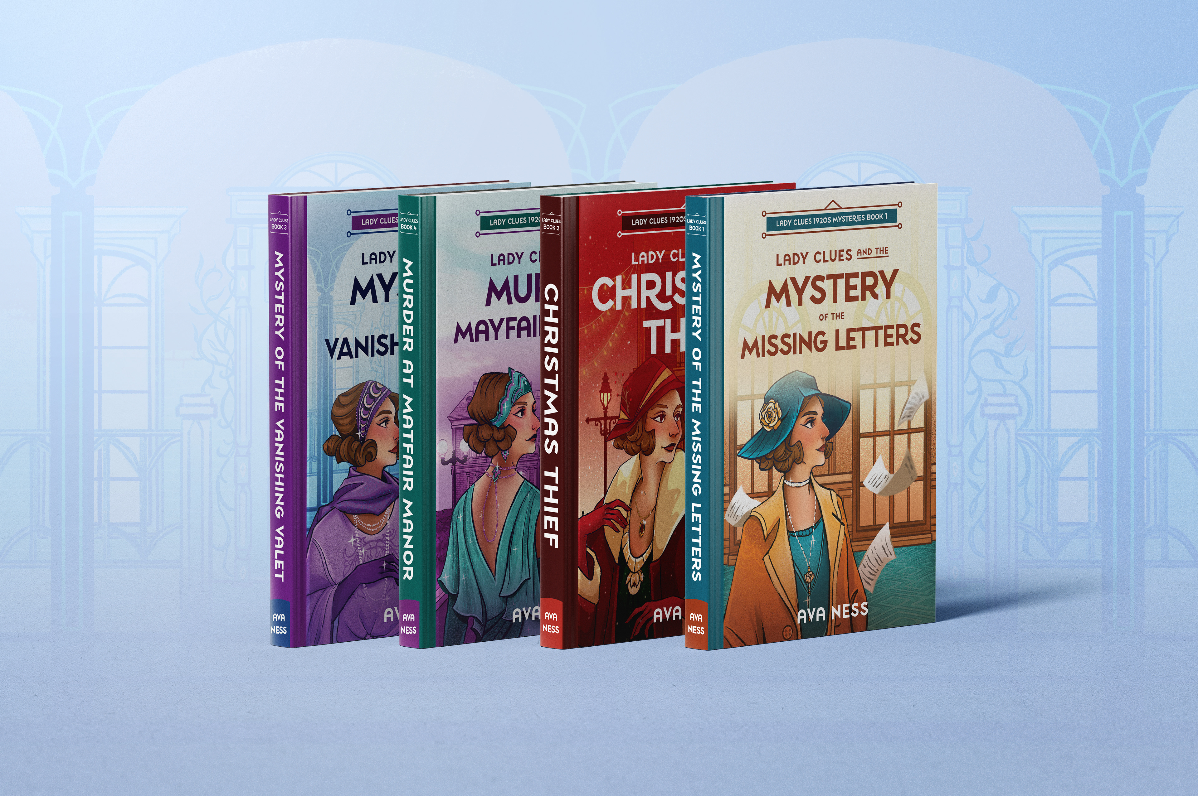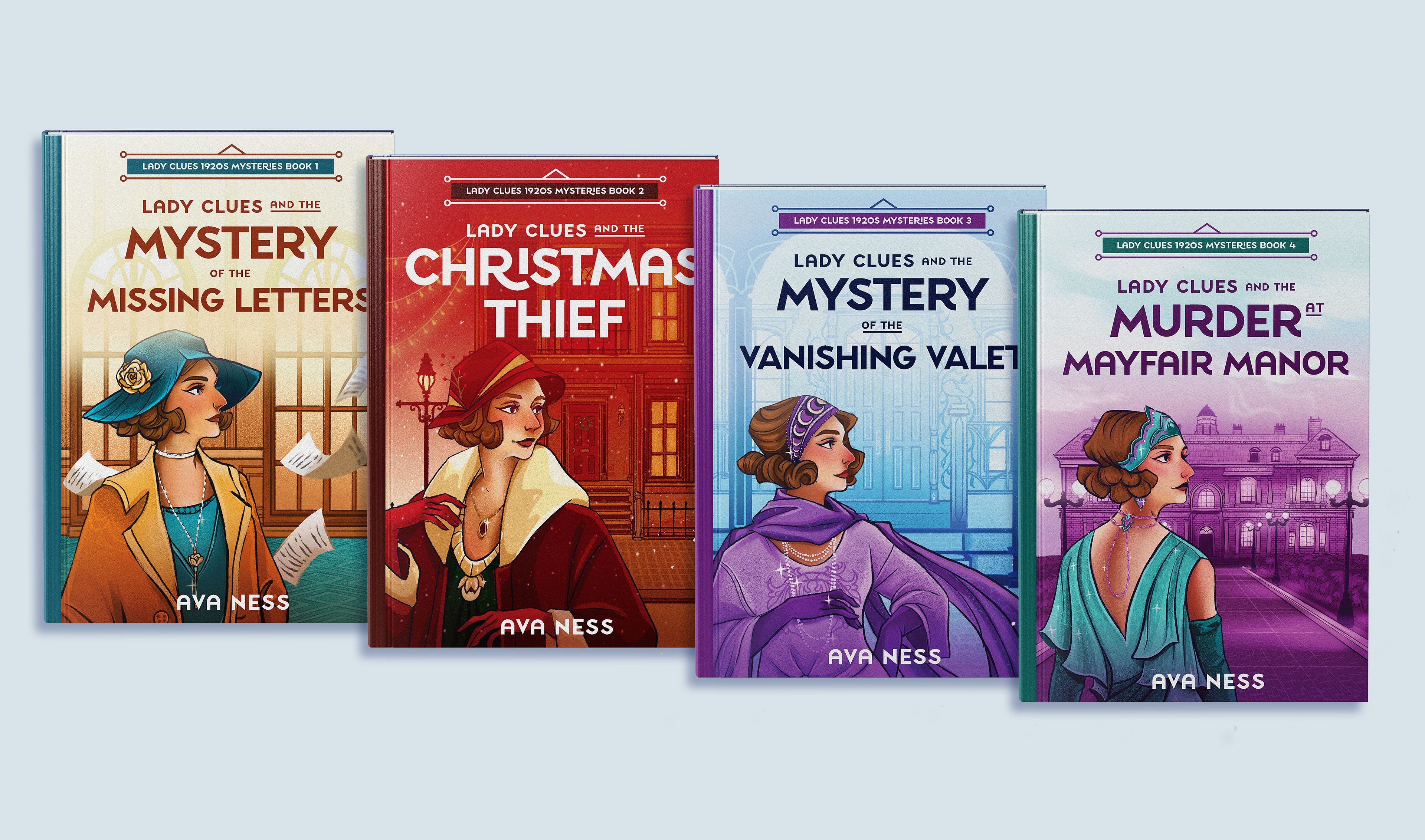 A set of illustrated book cover designs for the Lady Clues cozy mystery series by Ava Ness